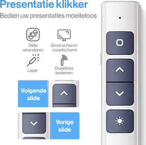 Laat elke presentatie soepel en professioneel verlopen met de Lumivéra® Presentatie Klikker! Deze draadloze presenter is uitgerust met een comfortabel bedieningspaneel, waardoor je alle belangrijke functies van je computer eenvoudig op afstand kunt bedienen. Wijs moeiteloos onderdelen aan met de ingebouwde laserpointer en klik met één druk op de knop door naar de volgende slide — volledig zonder onderbrekingen.