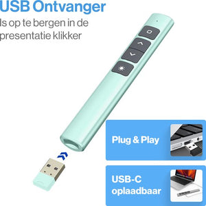Met deze presenter kies je voor gemak, betrouwbaarheid en professionele uitstraling. Dankzij het USB-C oplaadsysteem is jouw klikker altijd klaar voor actie, zonder batterijen of onverwachte storingen.